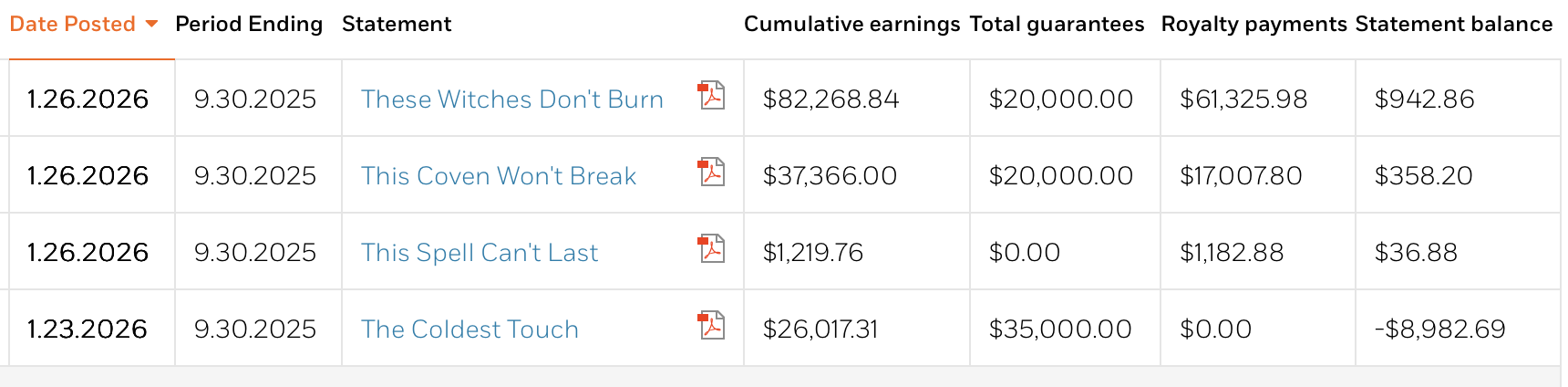 You may also notice that The Coldest Touch has a negative statement balance. That book has not yet earned out, and I'm not sure that it will unless future book releases give that title fresh attention or there's some other external thing (film/tv, for example) that makes it fresh again. (I also think it could benefit from a cover redesign, but that's not going to happen until there's something big externally that happens.)