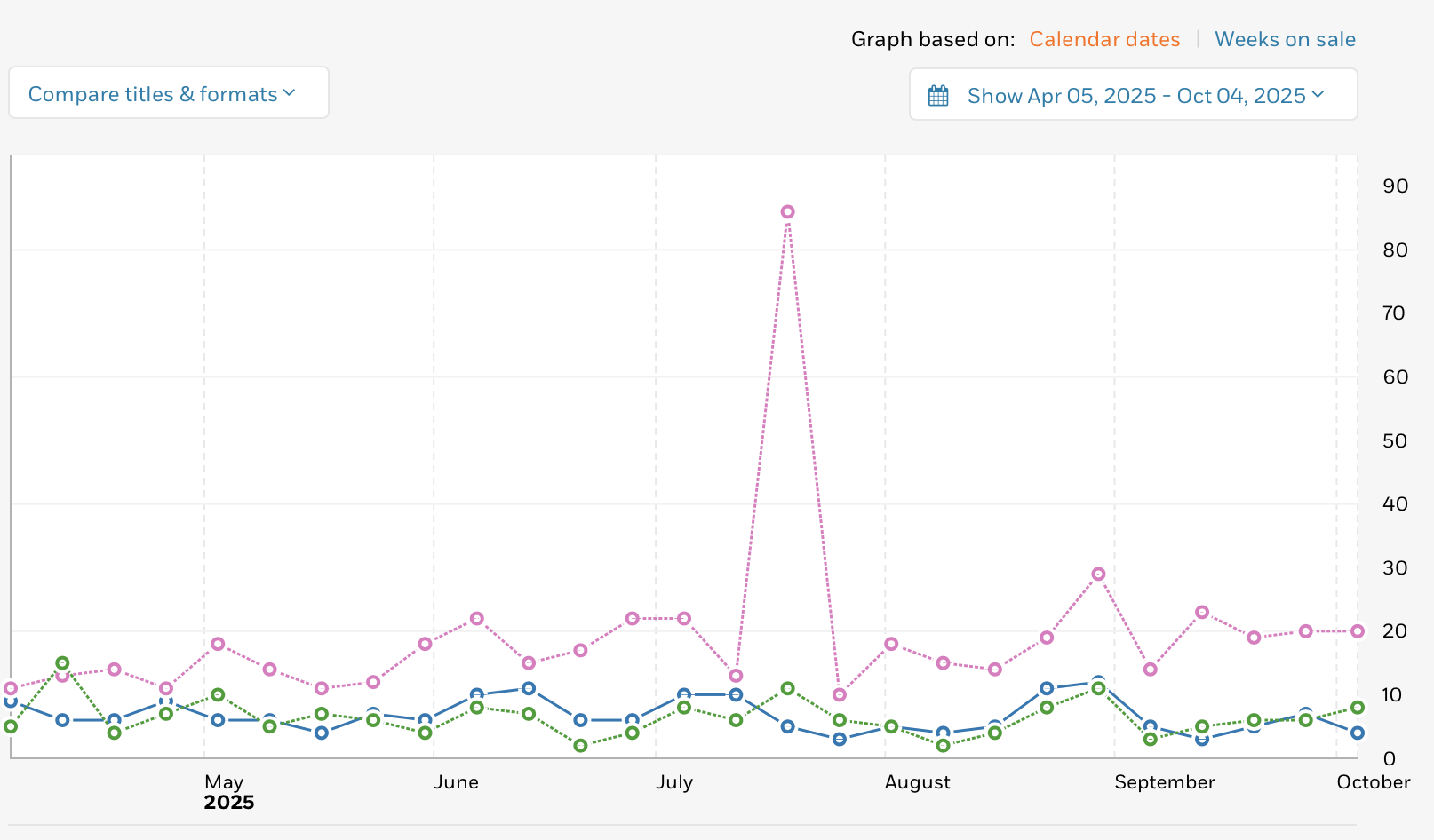 Astute math-people may notice some discrepancies with some of those numbers. For example, the royalty statement said TWDB sold 670 copies April 1 - Sept 30, 2025, whereas this graph only indicates 556 sales. There's always a bit of a gap between the portal and the royalty statement, which is the difference between point of sale tracking and shipped vs returns (at least, I'm pretty sure that's what it is).