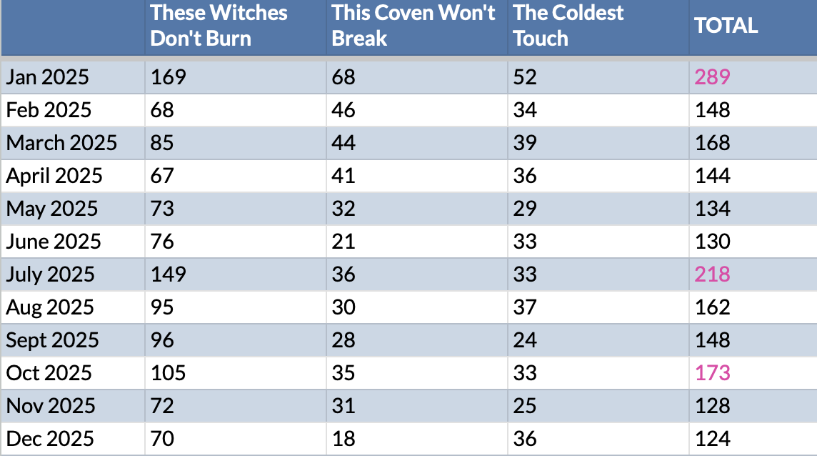 2 - Since my books are witchy, sales tend to be best around Halloween, and this sales period doesn't include the month of October. Although, as you'll see below, this year didn't have quite as much of a spooky season bump as is typical.