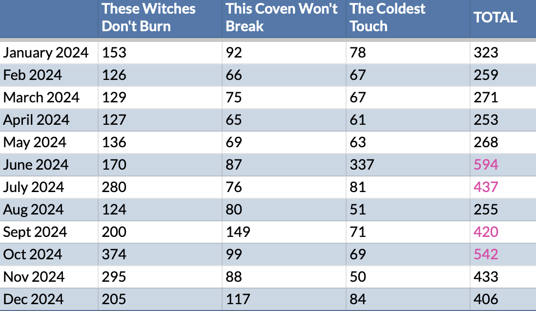 In the graph, These Witches Don't Burn is in pink, This Coven Won't Break is in green, and The Coldest Touch is in blue.